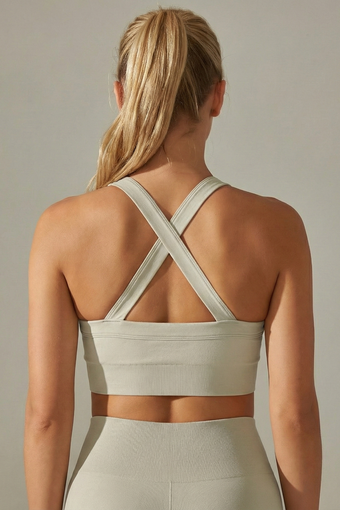 Det karakteristiske krydsryg-design fordeler vægten jævnt over skuldrene og giver stabil støtte uden at begrænse bevægelsen. De brede, flade stropper krydser elegant på ryggen og skaber et feminint og moderne udtryk. BH’en sidder sikkert og komfortabelt, både under aktivitet og i afslappede stunder.