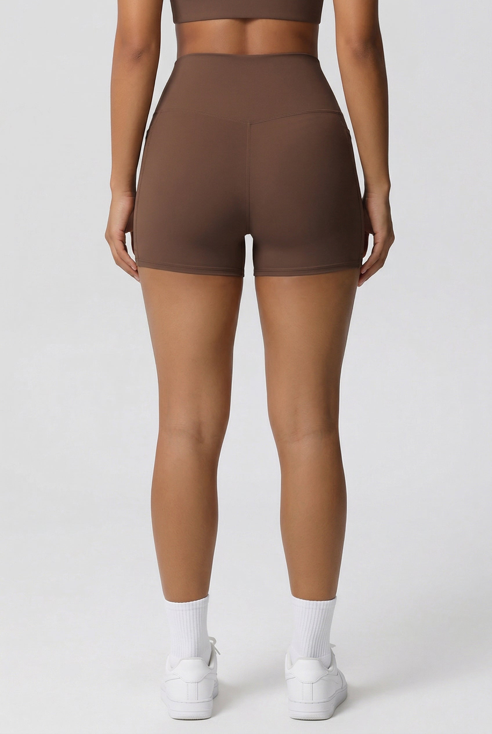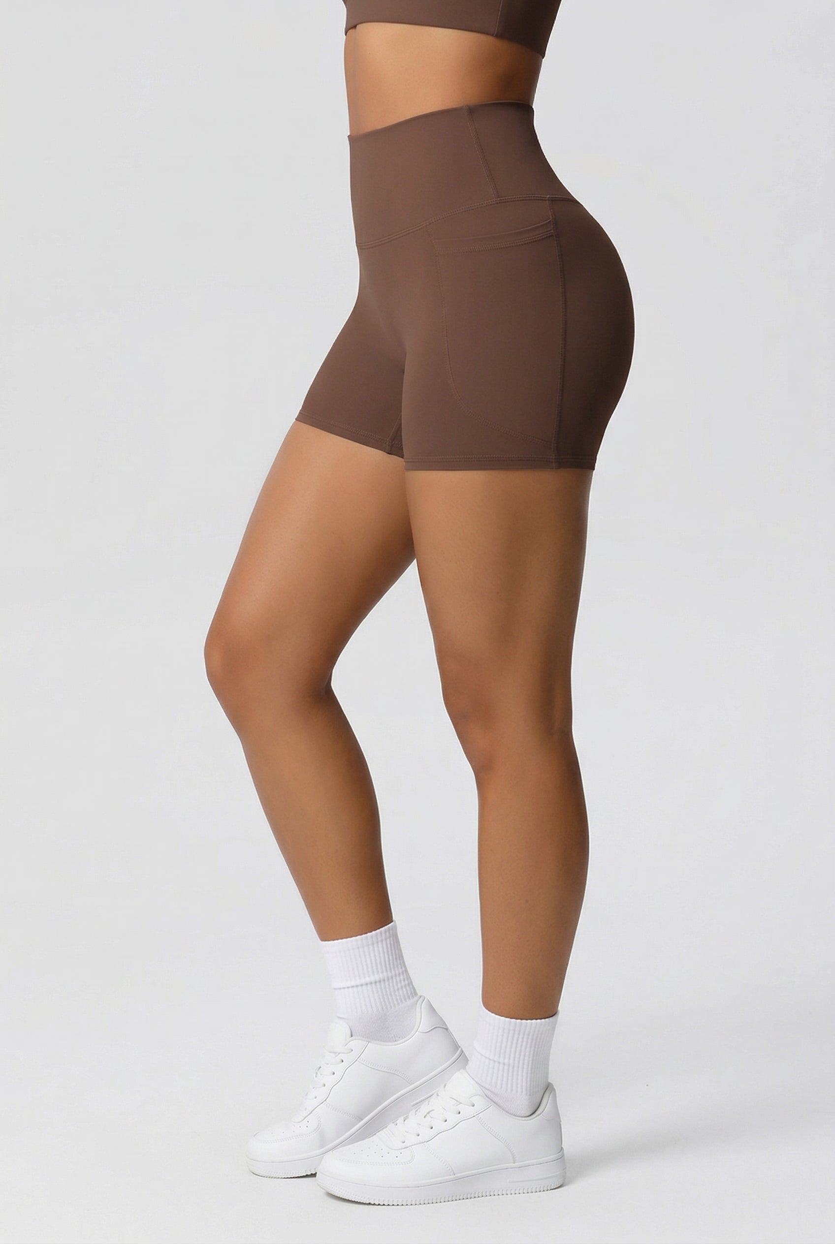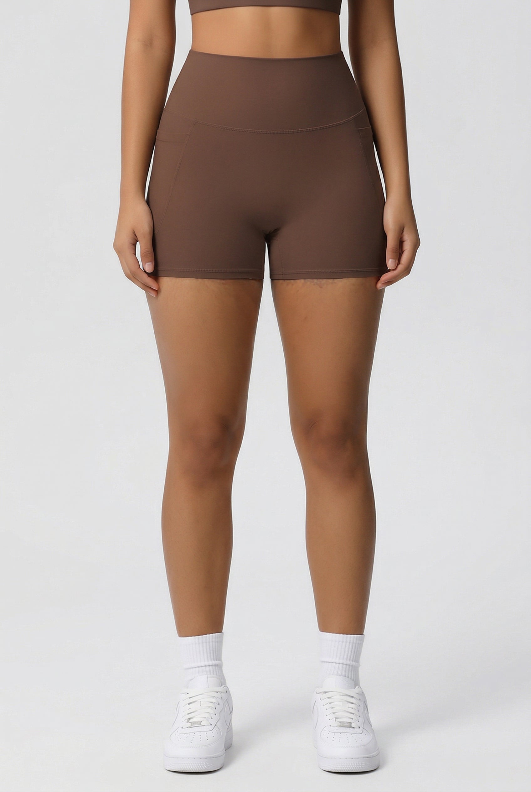 Træningsshorts med mid waist pasform og praktiske sidelommer til nøgler, kort og mobil. Det bløde strækbare materiale følger kroppens form og holder sig på plads under bevægelse – til både træning, yoga og hverdagsbrug.