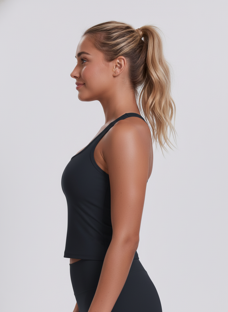 Toppen har et klassisk racerback design som giver fuld bevægelsesfrihed til skuldre og ryg. Længden dækker præcis nok til at give et flatterende og moderne udtryk, og den sømløse konstruktion forhindrer gnidning og irritation selv under lange træningspas. Den indbyggede bh med udtagelige puder giver ekstra støtte og mulighed for individuel tilpasning så du altid får den pasform der føles bedst.