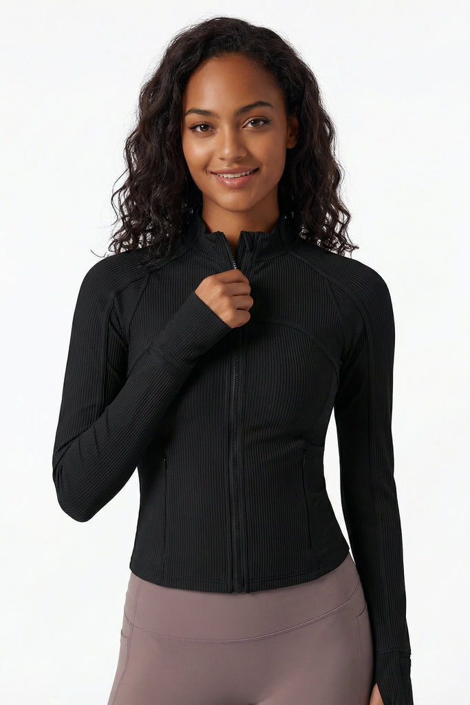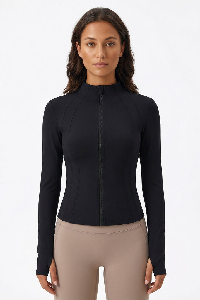 Zip-up trøjer og formsyede jumpsuits fuldender kollektionens athleisure-look. De er fremstillet i blødt, hurtigtørrende materiale med praktiske lommer til nøgler og mobil. Det ensfarvede sorte design matcher resten af serien og fungerer både til træning og hverdag.