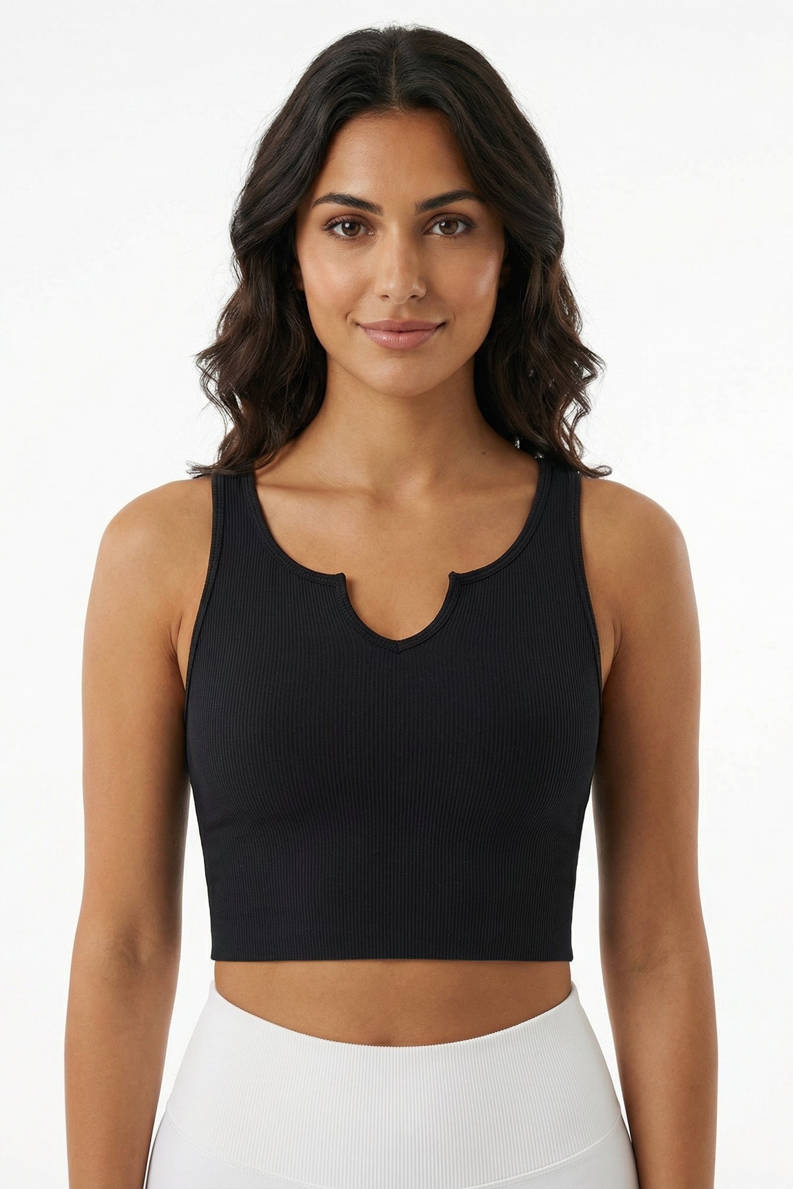 Denne sorte crop top med V-hals og indbygget BH er skabt til dig, der ønsker et feminint udtryk kombineret med praktisk støtte og maksimal komfort. Den elegante V-udskæring giver toppen et flatterende, moderne look, mens den croppede pasform passer perfekt til højtaljede leggings og shorts. Den sorte farve gør toppen til et tidløst og alsidigt valg i enhver aktiv garderobe.