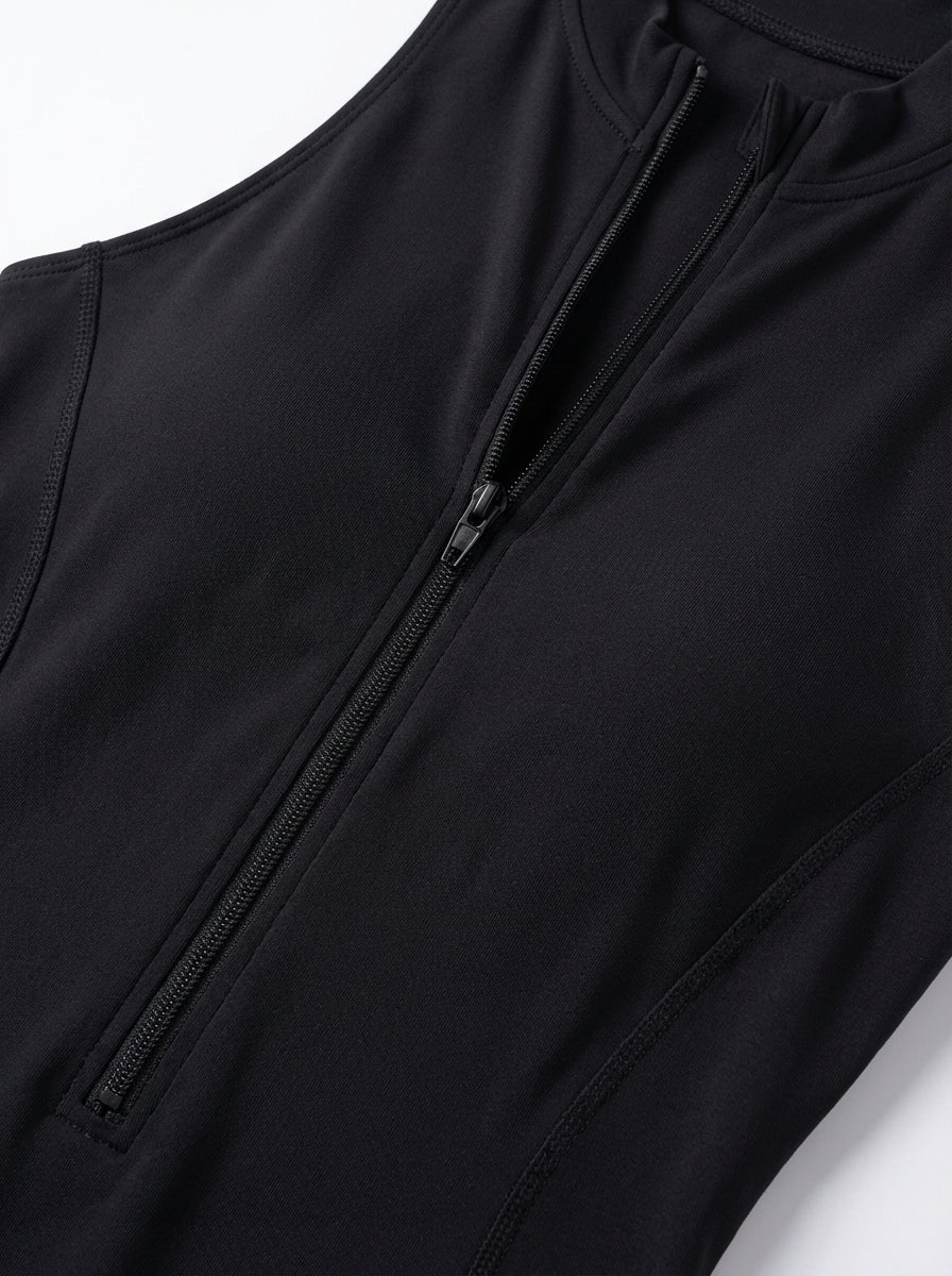 • Elegant Design: Fronten har en høj hals med lynlås, der giver et cool, sporty look, mens den åbne ryg med krydsede stropper tilføjer en feminin detalje og sikrer ventilation.