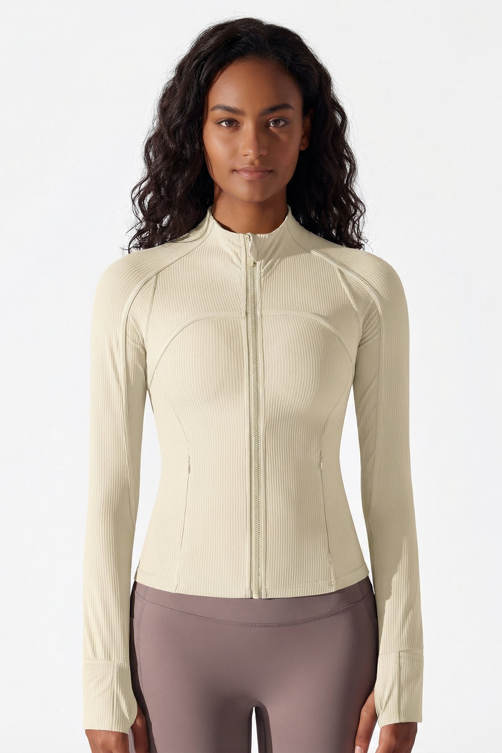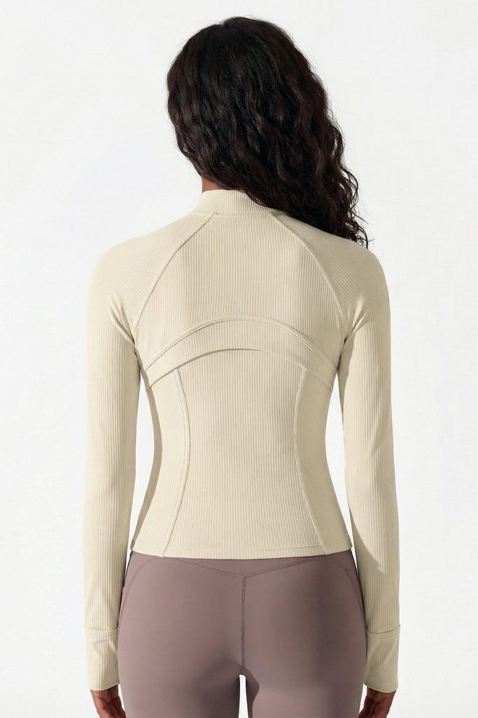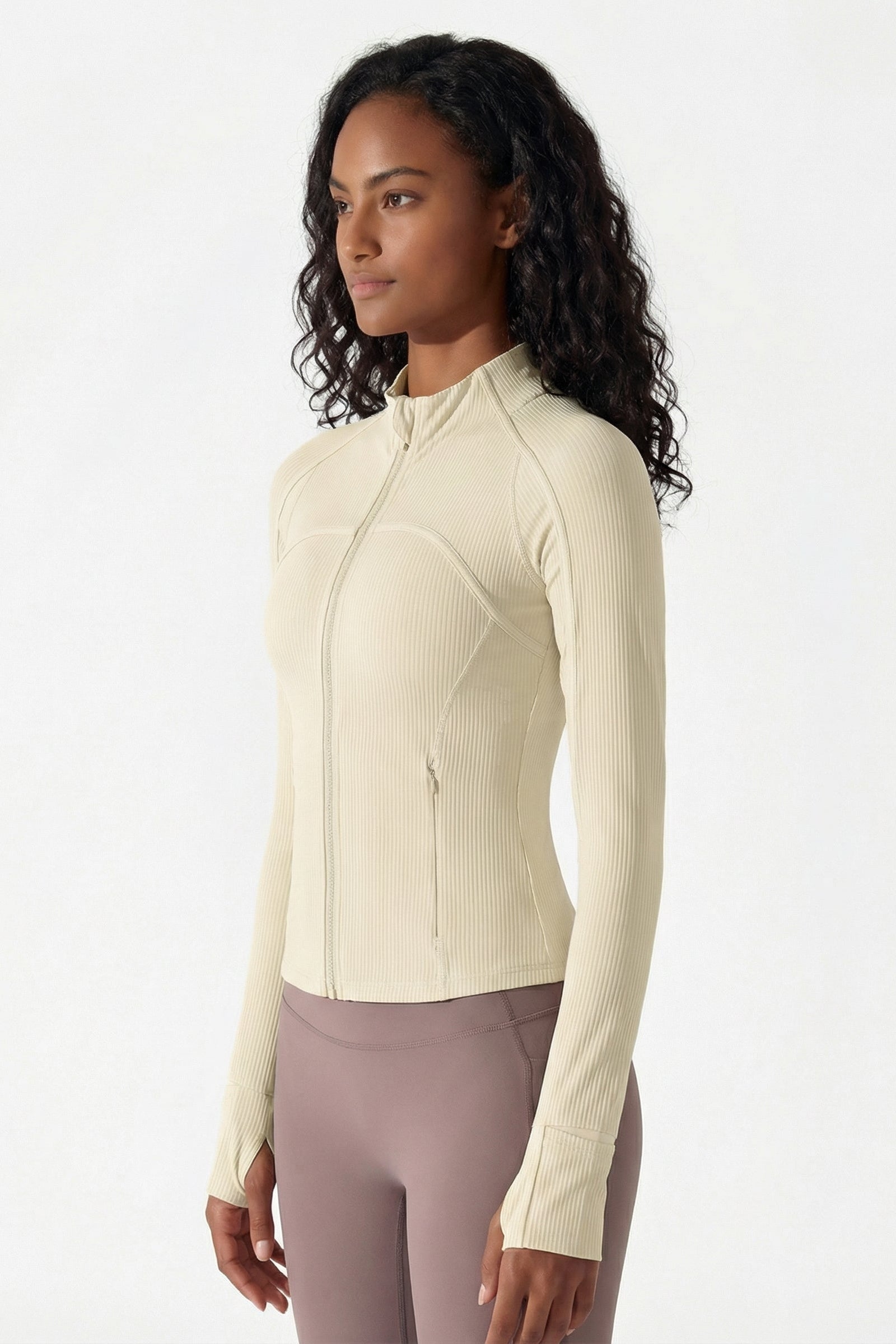 De lange ærmer har tommelfingerhuller som holder ærmerne på plads og giver ekstra varme og komfort på kølige morgener eller under udendørs træning. En funktionel detalje der gør jakken velegnet til både aktivitet og daglig brug.